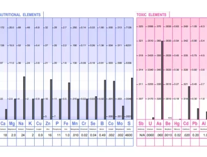 Below you will see an example of what a hair mineral test graph looks like. This is the graph that is produced by Trace Elements Inc from the hair that you submit. The graph shows 15 nutrient minerals, 14 additional minerals, 8 toxic metals, 7 significant mineral ratios, 9 toxic ratios and 11 additional mineral ratios.